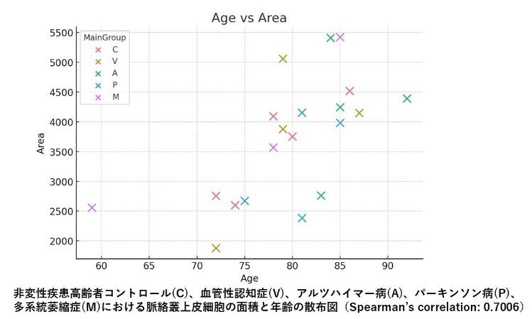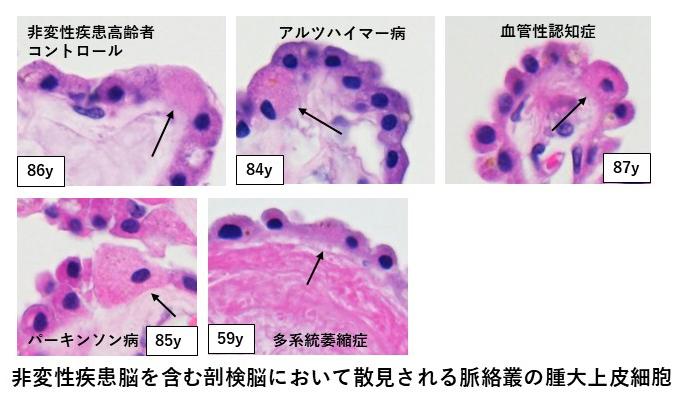アルツハイマー病、血管性認知症、パーキンソン病、多系統萎縮症を含むヒト剖検脳を用い、AI支援画像解析(Cellpose+Python)により多量の細胞以上を定量解析した結果、上皮細胞の肥大とTOM20陽性領域の増加に有意な正の相関を認めた。